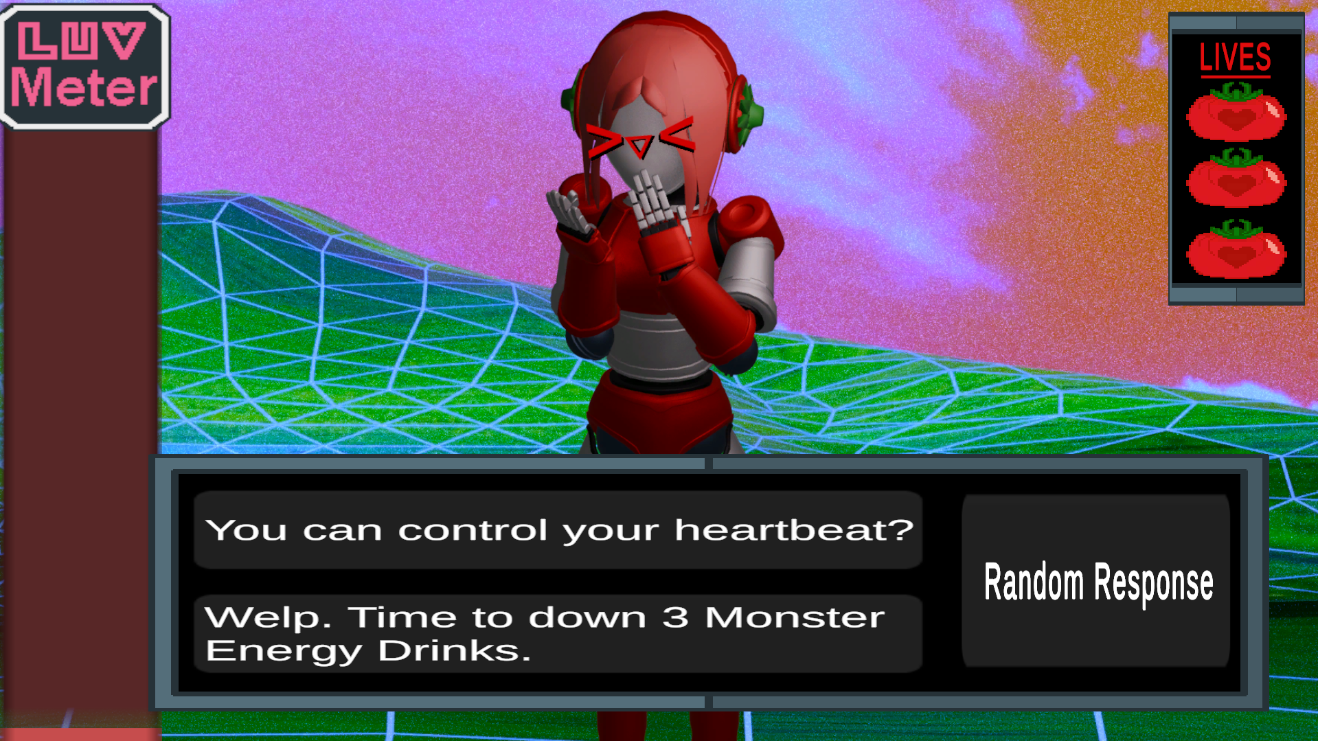 Embark on a short yet, over the top satirical dating sim journey. Where you play as a user playing a dating sim VR game. This is about K3TCH a robot apart of a game series called Crossed Circuits. Through this adventure you figure out that things aren't quite what they seem.